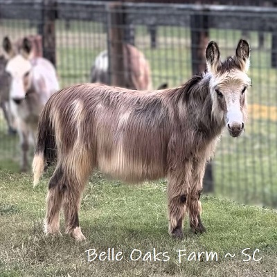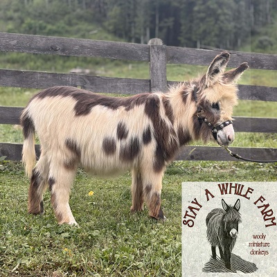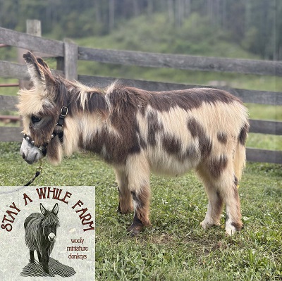 This beautiful yearling, who was sold in our Spring 2025 online auction, is being offered again due to the owner downsizing amid some personal issues. Patty is super sweet, leads extremely well, and loves being brushed. She retained her gorgeous hair all summer, even in the South Carolina heat. She is starting to shed out some around her face and neck revealing a light tawny brown color. She is one of the woolier donkeys Stay A While Farm has produced over the years, extremely well built, and sweet as pie. If the best of the best in wooly donkeys is your thing Patty is your gal. She is a doll.