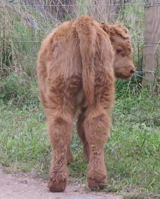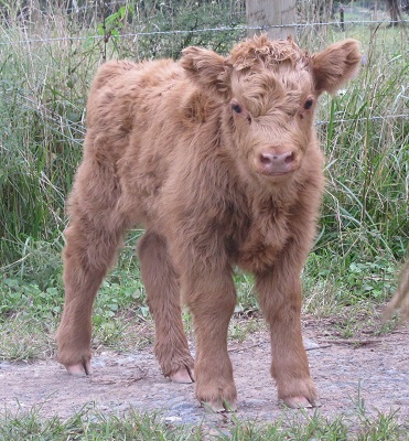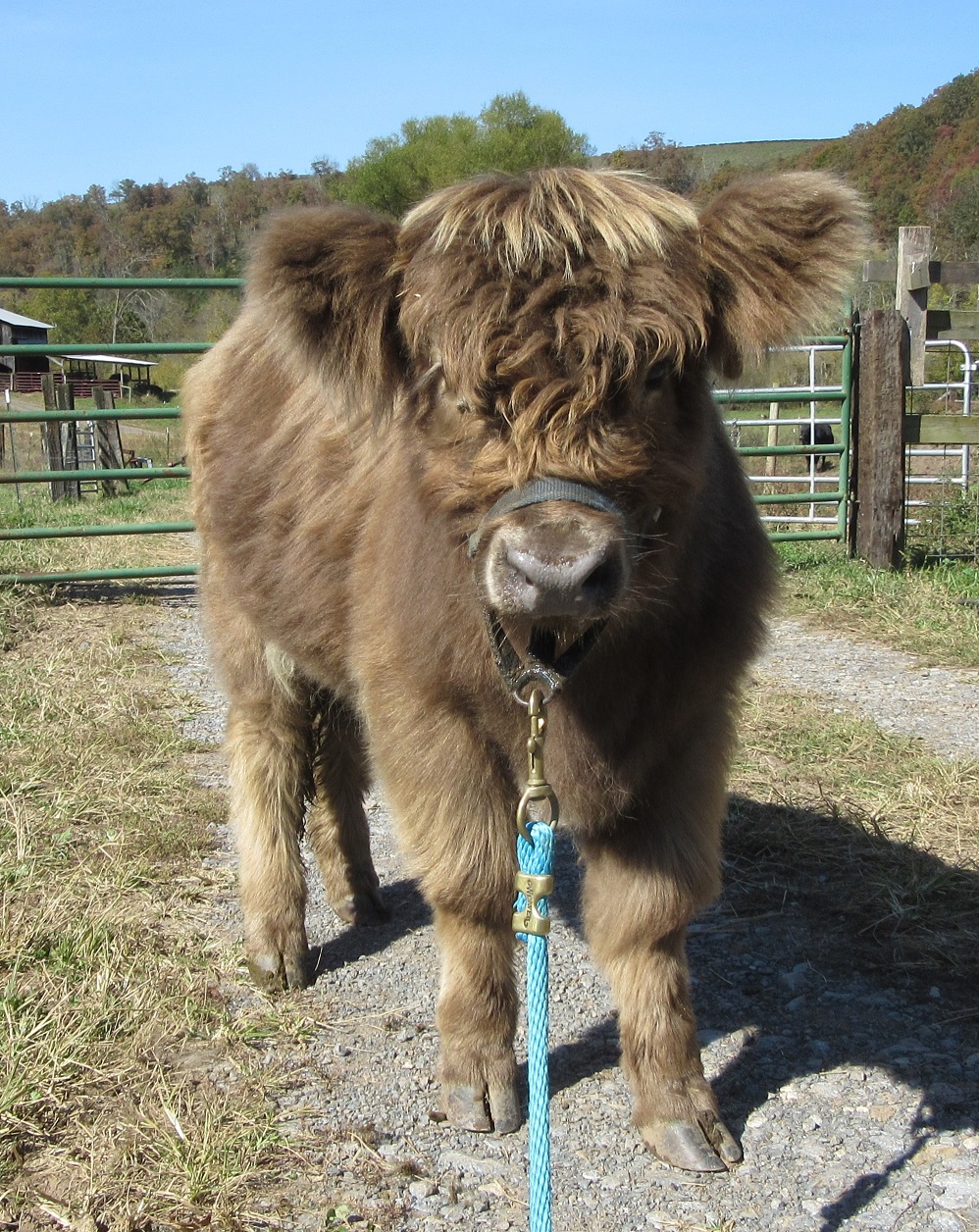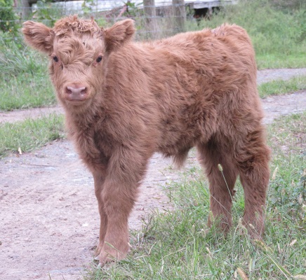 Pure miniature Highland bull calf. He is a yellow (eeDd) so he will be able to produce all the colors depending on what color cow you put him on. He was mother raised and weaned at 4 months of age for training. He is friendly, enjoys being scratched, and is started in halter. USDA EID tagged, dewormed, vaccinated with Triangle10, 20/20 Vision7, & M.haemolitica/Pasteurella. Price includes vet health certificate for interstate travel.